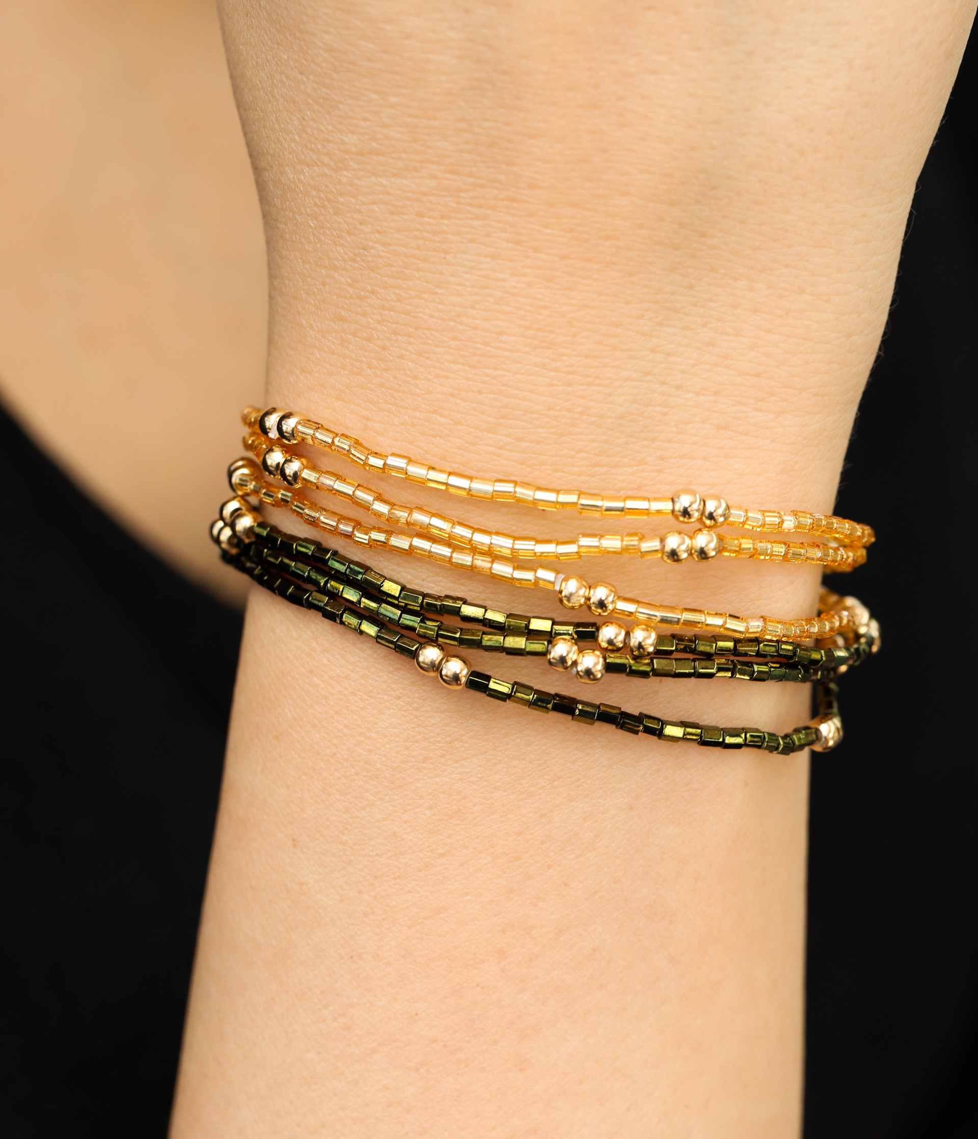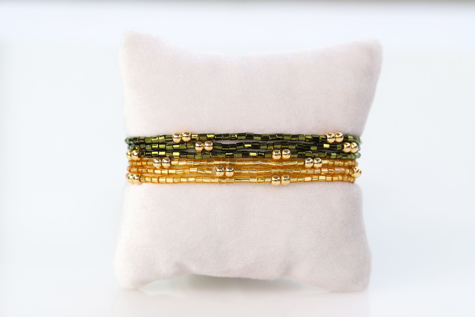 Set de 6 bracelets élastiques en perles de verre Miyuki et boules d’argent trempées or. Ce set oppose un vert franc à un doré chaleureux. Article iconique de cette collection, Macaron pistache incarne une opulence sophistiquée et une élégance assumée.